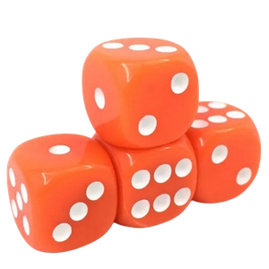 Tärningsset i ogenomskinlig/opakorange akrylplast med vita prickar, levereras i clamshellblister.