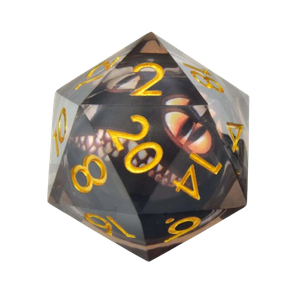 Tärning med flytande kärna i resin: Tillverkad av högkvalitativ resin, denna d20-tärning är handgjuten och har vassa kanter. Inuti finns en flytande kärna med gnistrande partiklar.