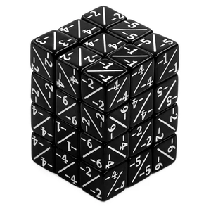 Tärningens sidor är markerade -1/-1, -2/-2, -3/-3, -4/-4, -5/-5 och -6/-6. Levereras i tärningskub av hårdplast.